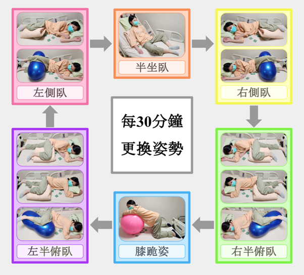 待產期間,媽媽除了可執行非藥物減痛方法所提到的姿位改變及活動,也可嘗試「依序轉動」:半坐臥、右側臥、右半俯臥、膝跪姿、左半俯臥、左側臥,每個體位停留30分鐘再更換,可改變寶寶的位置及改善子宮的血液循環,引發更強烈的宮縮以促進產程。